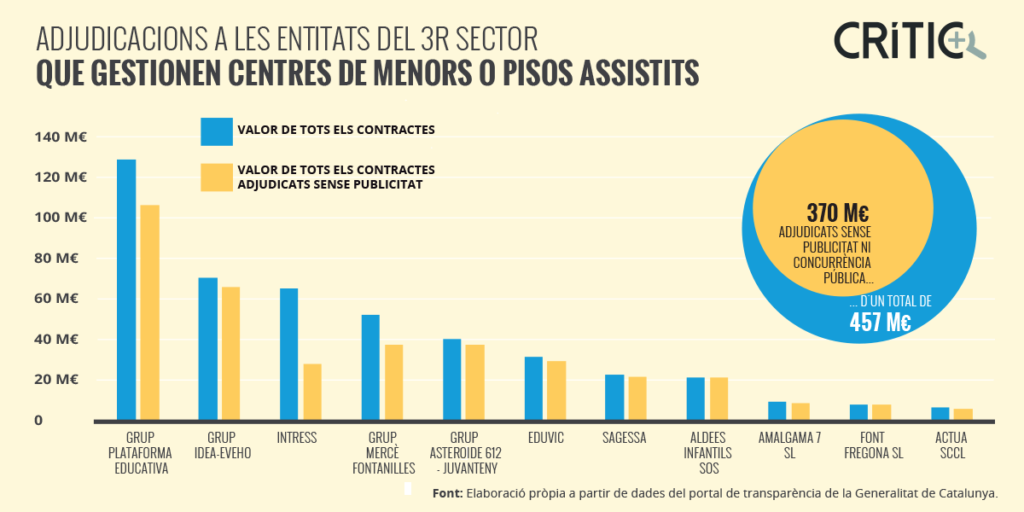 Los centros de menores están en el ojo del huracán después de la emisión del documental ‘Desamparados’ de TV3. La mayoría de estos equipamientos son gestionados por fundaciones y entidades sin ánimo de lucro. Pero el sector mueve mucho dinero y no siempre de forma transparente los datos analizados por CRÍTIC revelan que 4 grandes grupos y 7 entidades han recibido 370 millones en los últimos 10 años con contratos negociados sin publicidad. Las entidades del tercer sector defienden su gestión pero al mismo tiempo proponen un nuevo modelo de acción concertada que garantice que nadie se lucre prestando servicios sociales.