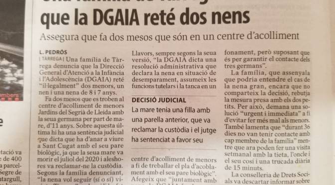 Una patrulla de 4 mossos y dos técnicos de la DGAIA se los llevan del centro escolar, sin ninguna explicación, hasta que ya estaban en un centro de acogida a más de 50 kms Tàrrega. La familia no pudo verlos ni hablar con ellos hasta 36 días más tarde.