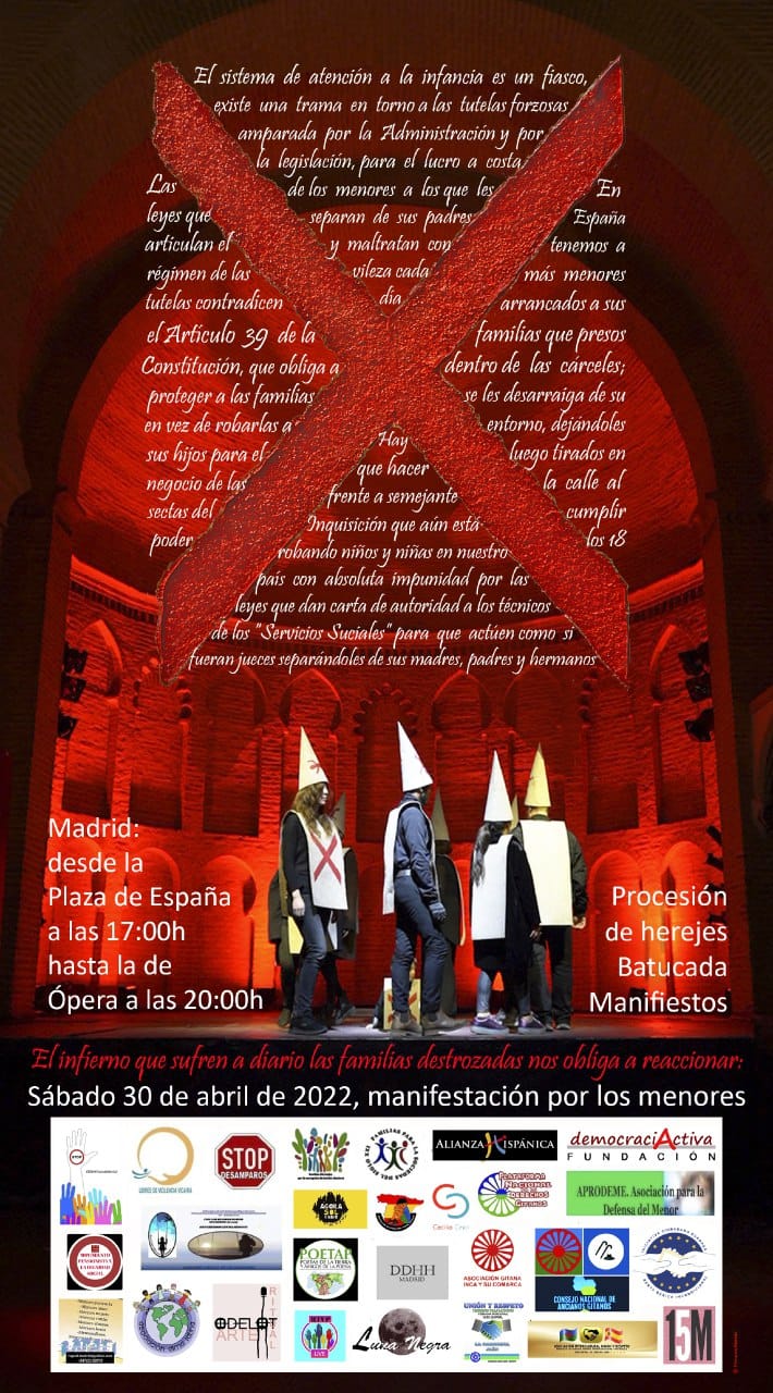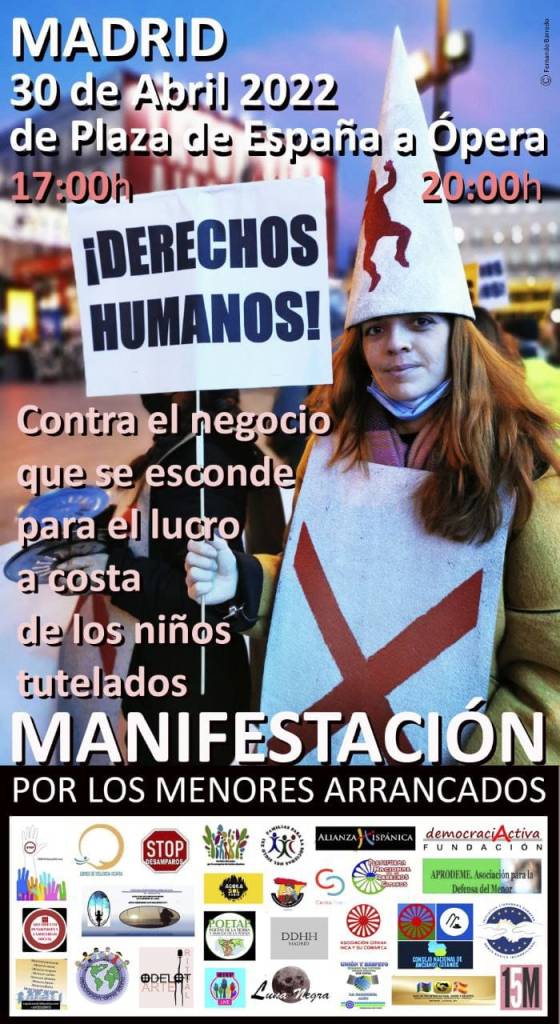 Para el próximo sábado 30 de abril está convocada una manifestación en Madrid contra las tutelas injustas. El sistema español de protección de menores, en demasiadas ocasiones, no funciona adecuadamente; porque en lugar de ayudar a las familias, en muchos casos, los Servicios Sociales adoptan injustificadamente medidas radicales apartando a los niños de sus casas, de sus familias; muchos de estos niños no volverán nunca a su hogar.