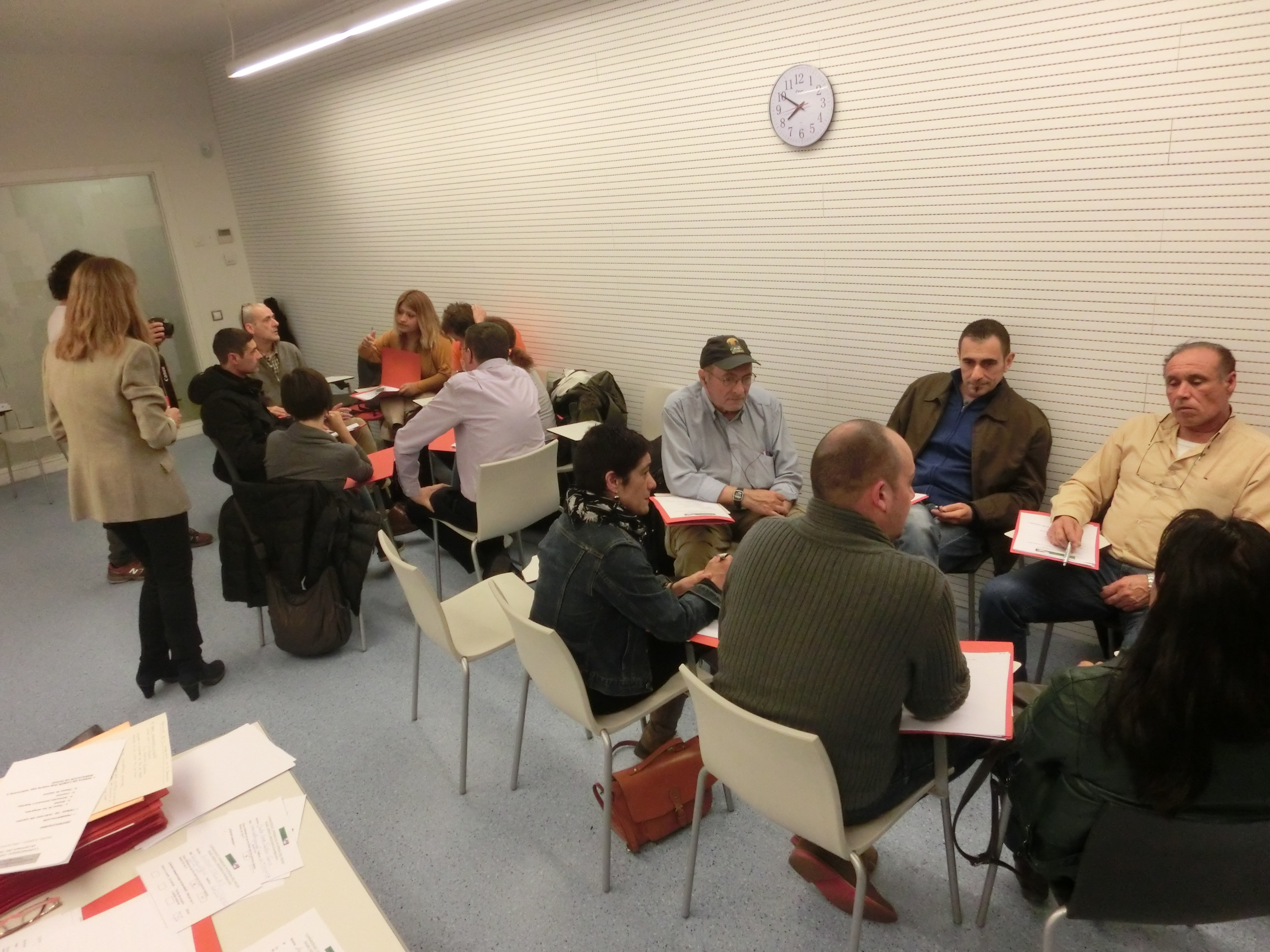 A continuación nos dividimos en grupos de 6-7 personas para que cada uno pudiese explicar su experiencia, dificultades, inquietudes, plantear preguntas… Se propusieron varios temas para centrar el debate. Posteriormente se hizo una puesta en común donde un portavoz de cada grupo planteó lo discutido en ese grupo y efectuó las oportunas propuestas.
